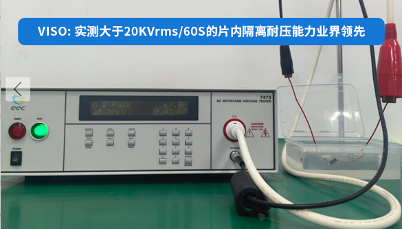 CCi8335系列芯片因超高壓耐壓需求而生,實(shí)測(cè)數(shù)據(jù)顯示: AC BV和SURGE峰值都超過(guò)了24KV, VISO=8KVrms; VIOWM至少可達(dá)到2000Vrms和2828Vpk,動(dòng)態(tài)CMTI>150V/ns, 達(dá)到了目前國(guó)際領(lǐng)先的隔離耐壓水平。